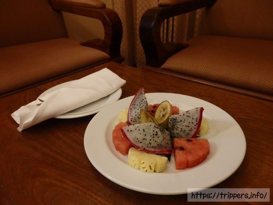 冷蔵庫にはウェルカムフルーツがありました。用意されてから時間が経過している感じです。ウォーターボトルは何本でも無料との事です。