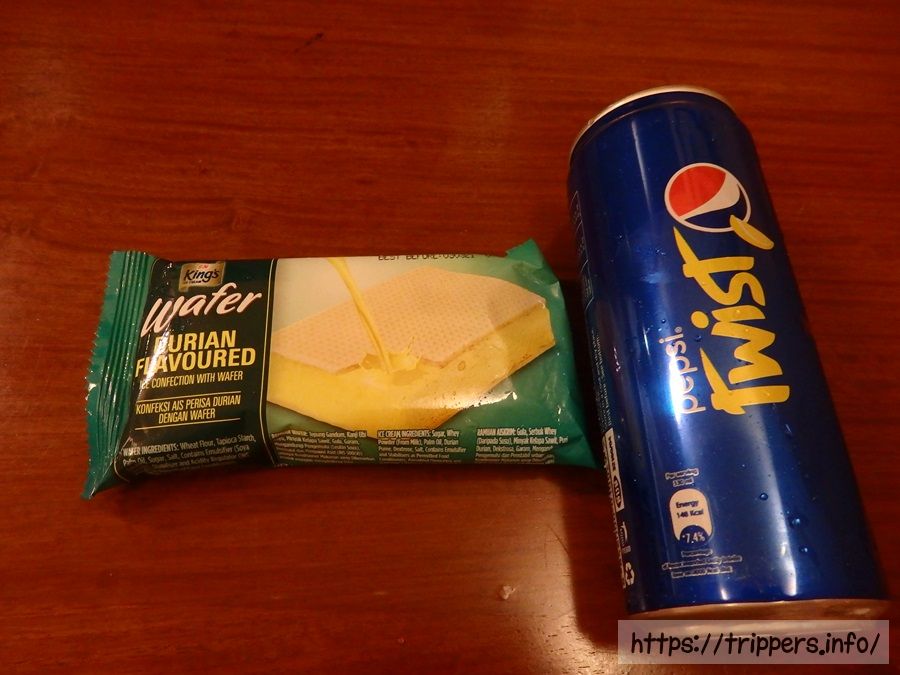 コンビニで夜食の買い出しです。売られているものは外国からの輸入品ばかりでした。シンガポール産であろうドリアン味のアイスを買ってみました。日本では売られないであろう味の代物です。