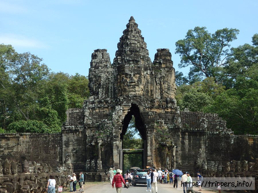 アンコール・トムの外枠にある南大門にやって来ました。アンコール・トムは南にあるアンコール・ワットが造られてから半世紀後の12世紀末に造られました。中心に位置するのはバイヨン寺院です。