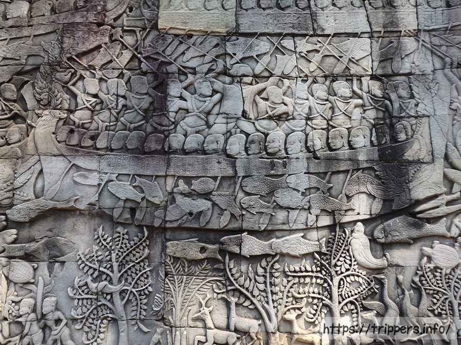 第一回廊の壁画です。当時の暮らしや戦いの様子が描かれています。アンコール・ワットの壁画は宗教や政治色が強いですが、ここのは日常的な生活が描かれています。