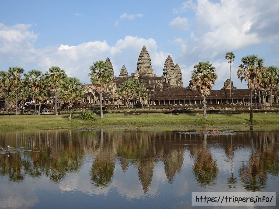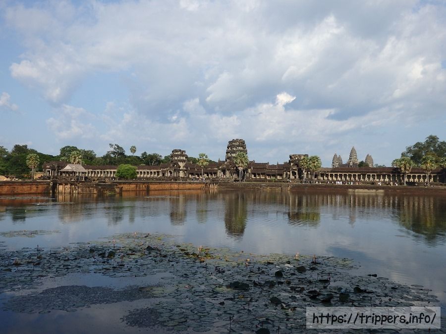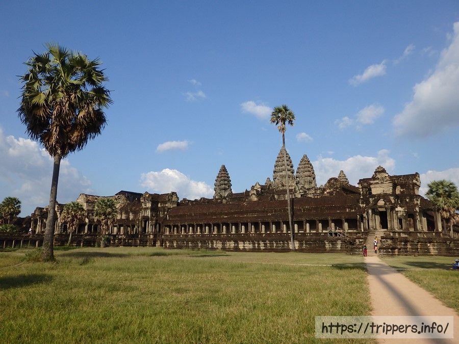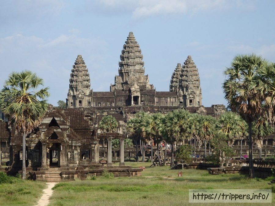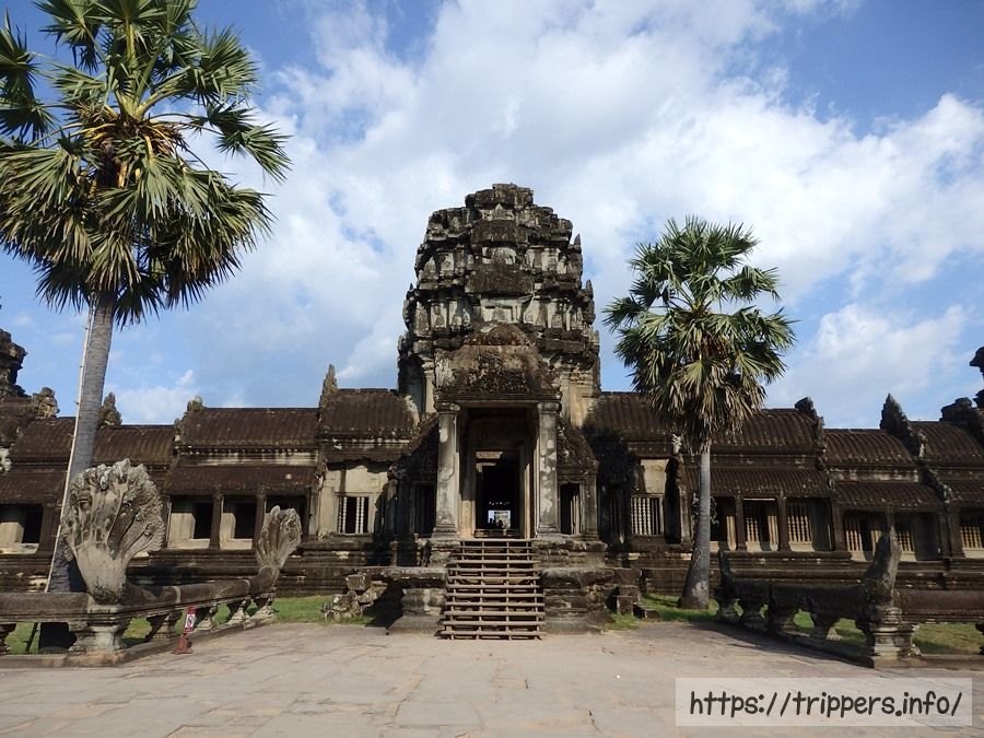 アンコール・ワットのメインの建物が見えてきました。手前に見えるのは経蔵で左右にあります。書物を収蔵する場所ですが、当時はヤシの葉や動物の皮などに記録を残したため、記録は朽ちて残っていません。