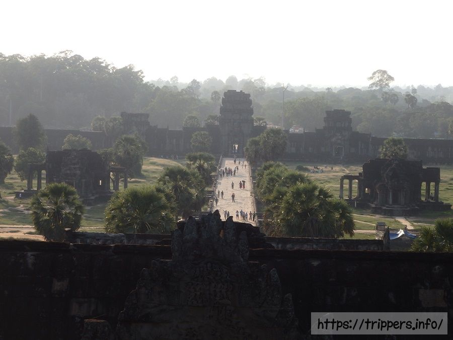 シェムリアップにおいて、ここからの景色が一番高い場所からの眺めになります。遠くまで続く参道を見下ろせ、一番手前の壁が第一回廊です。その奥に左右対称にある建物が経蔵で、奥の壁が周壁です。