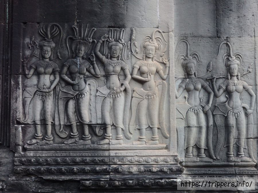 第二回廊まで降りてきました。アンコール・ワットの観光はこれでひとまず終了になり、出口へ向かいます。この壁画はデバターのレリーフで第二回廊には200体以上描かれています。デバターは日本語では「女神」と言う意味ですが、ここに描かれているのは女官や踊り子たちをモデルにして掘られたものです。