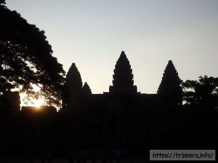 アンコール・ワットのシルエットが沈む太陽が際立たせてます。この後はプレループで夕陽鑑賞しに向かいます。