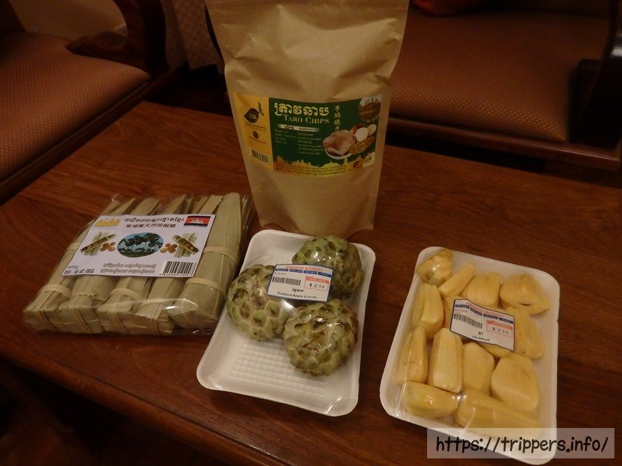 スーパーで購入したのはカスタードアップルとジャックフルーツの果物。そしてパームシュガーやばら撒きようのお土産です。