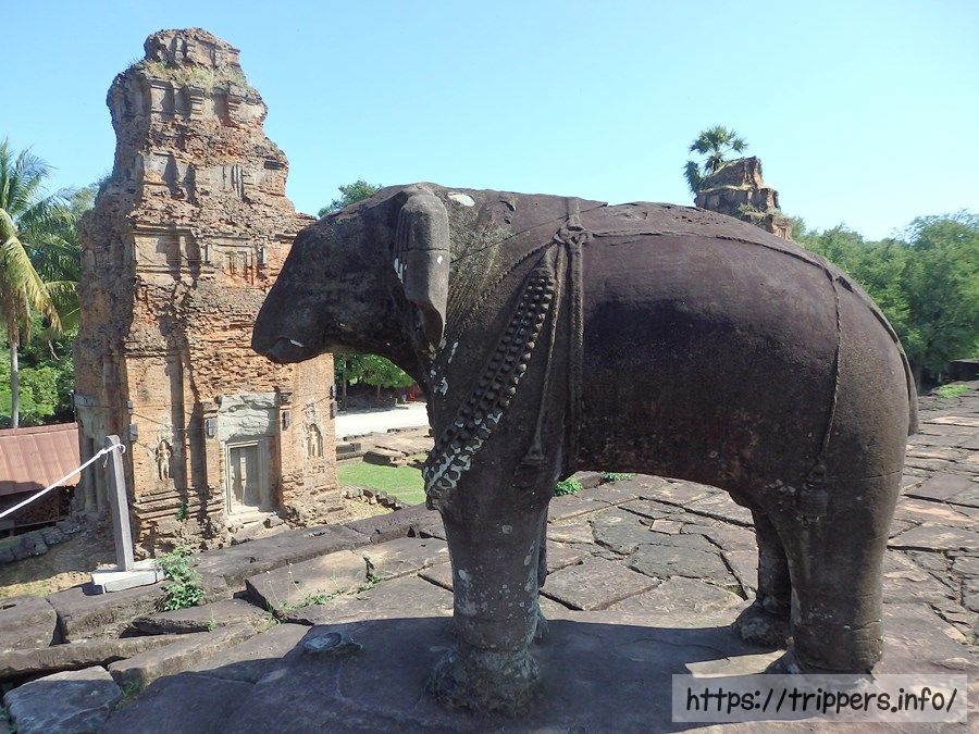 次はプリア・コーです。プリア・コーは聖なる牛と言う意味です。寺院中央の祠堂群の前方にあって対面する3体の砂岩の彫像の聖牛ナンディンより名付けられており、シヴァ神の乗り物です。879年に創建されています。