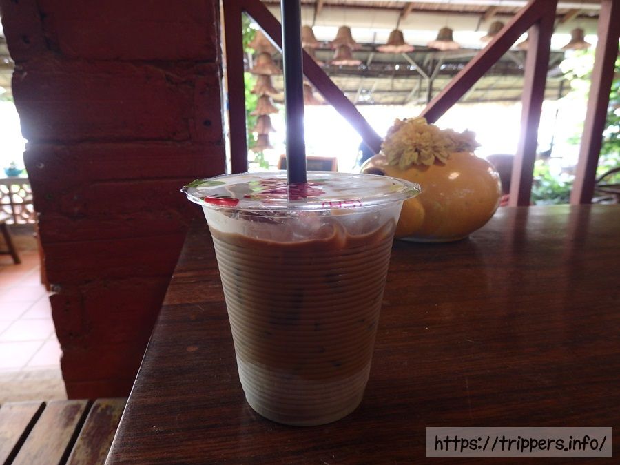 ローカルアイスコーヒーのミルク入りで水分補給です。東南アジアで定番の練乳たっぷりのコーヒーで牛乳は入っていないホワイトコーヒーです。