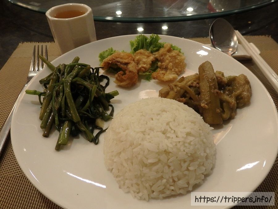 プノンペン国際空港の前に、プノンペンのレストランでの夕食があります。空港の近くにあるJasmine Restaurantです。車窓からは田園風景や田舎の街並みが映り過ぎていきます。