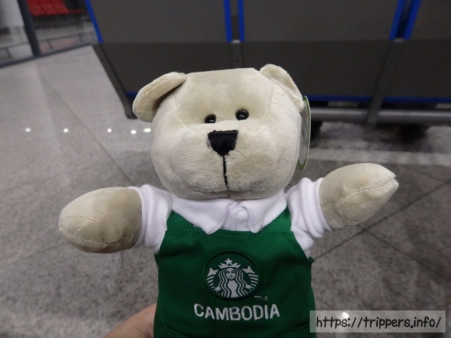 自分用のお土産スーベニアとして何か欲しかったと思っていた時の出会いで、買ってしまいました。服にカンボジアと書いてあるだけで、カンボジアでのお土産と分かるのが良いですね。眠っていた収集癖が目覚めそうです。街中のスターバックスだと20ドルですが、空港内なので24ドルでした。