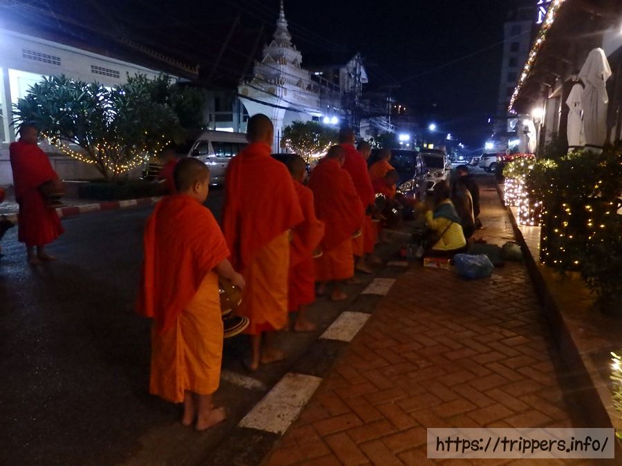 施しをする住人の数はあまり多くありません。5時ぐらいから始まるため、まだ外は暗く、車の交通量も少ないです。静かな夜に実施される様はとても神秘的でした。