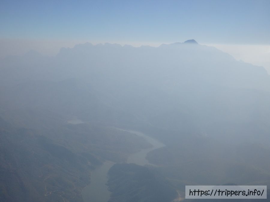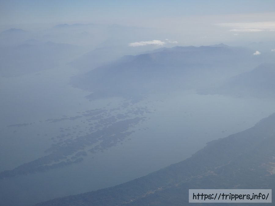 低空飛行のため、窓からはラオスの自然が良く見えました。山が多く、海はないのに川や湖など水が豊かなのが良く分かります。今見えているのはナムグムダムだと思います。海かと思う程の大きさです。