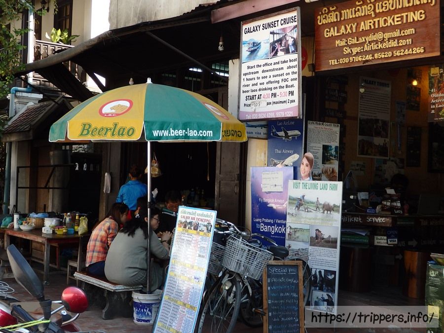 寺院観光はこれで終わりで、明日の観光ツアーを申し込みに行きます。日本観光客にはクチコミで良く知られているマニファトラベルでツアー予約をしました。象乗り・パークウー洞窟・クアンシーの滝の3つがセットになった1日ツアーで1人35USD(315,000キープ)です。ネットやホテルで申し込むと40USDになります。