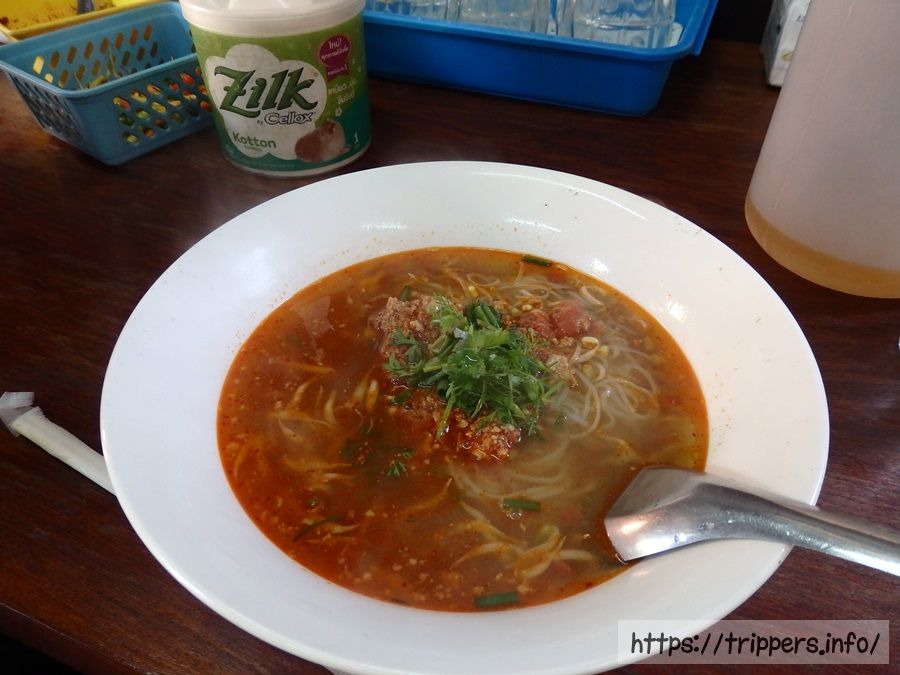 辛さは自分で唐辛子を入れて調節するようです。お味は程よい辛さで美味しかったです。カオ・ソーイとは辛味噌を使ったルアンパバーンなど北部限定の麺料理です。タイのカオ・ソーイとは別物になります。