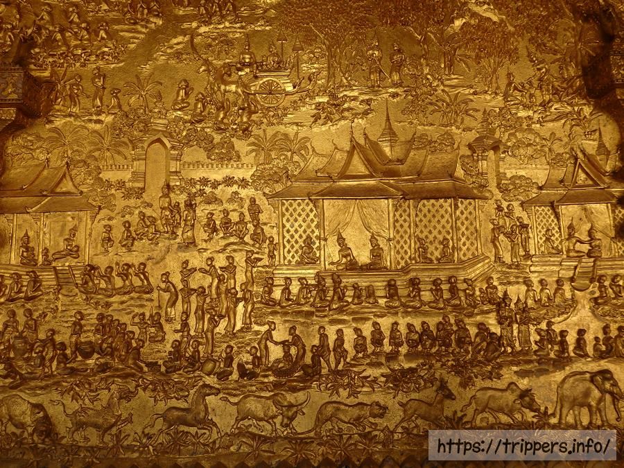 本堂の壁一面に精巧な彫刻が施された金のレリーフはラーマーヤナの物語が描かれています。