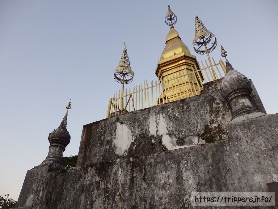 時刻は17:00過ぎで、夕陽が綺麗な時間です。ルアンパバーン国立博物館の周囲はナイトマーケットの準備が始まっています。博物館周辺に臨時駐車場が出来ており、そこに自転車を止めました。そして博物館の目の前にあるプーシーの丘に登ります。ここも入場料が20,000キープです。