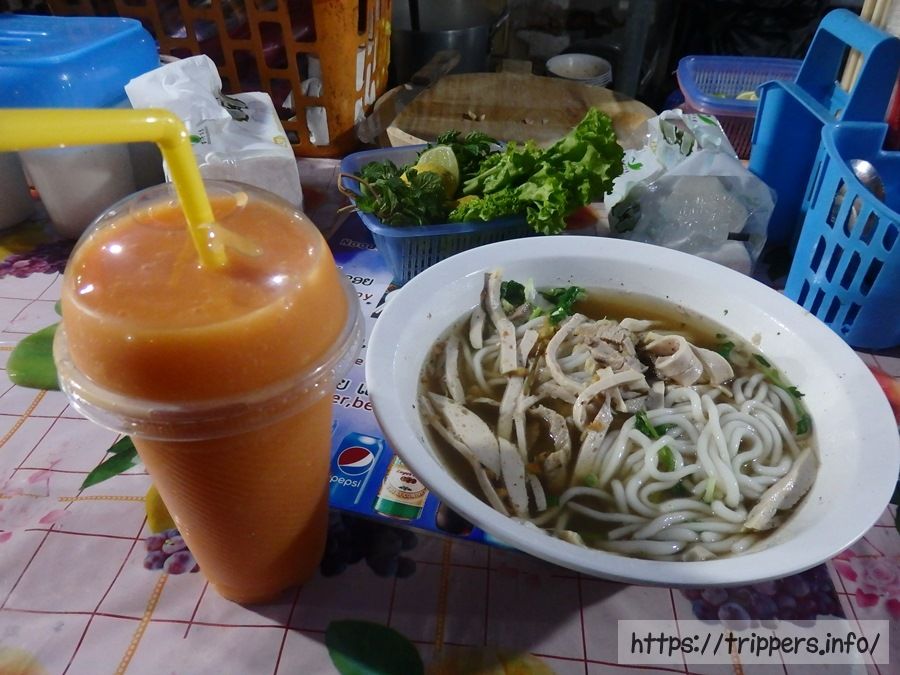 夕食は米麺とフルーツシェイクです。米麺は普通に美味しく食べやすいです。ライムを絞って食べるのはベトナムっぽいですね。ラオスにはベトナム料理やタイ料理も見かけます。