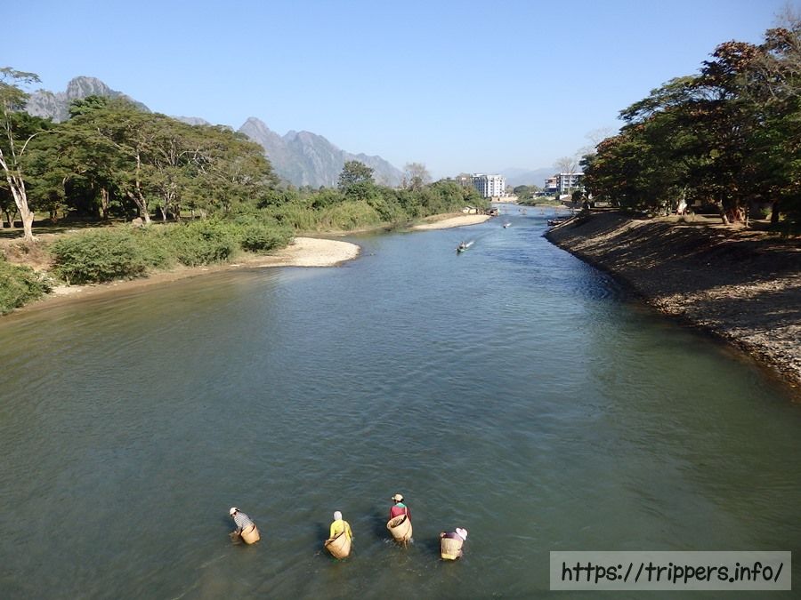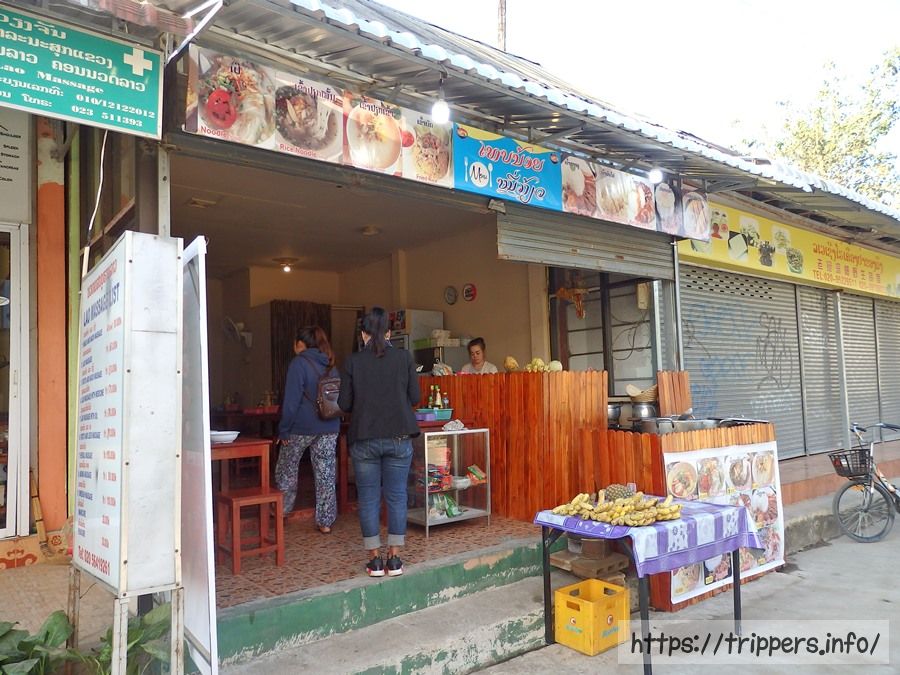 まずは宿泊先の近場で朝食にします。バンビエンはガイドブックに載っている情報は少ない場所で、「地球の歩き方」だと2ページです。朝開いているお店はほとんどなく、朝市を見かけないと思ったら、中州の近くでやっているようです。朝市は明日行きます。