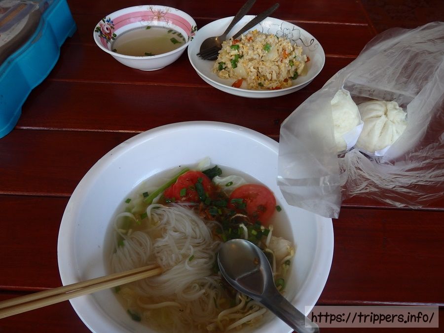 米麺と肉まん(サラパオ)です。肉まんの中には肉の他にゆで卵が入っているのがラオスの王道のようです。米麺と共に優しい味でした。