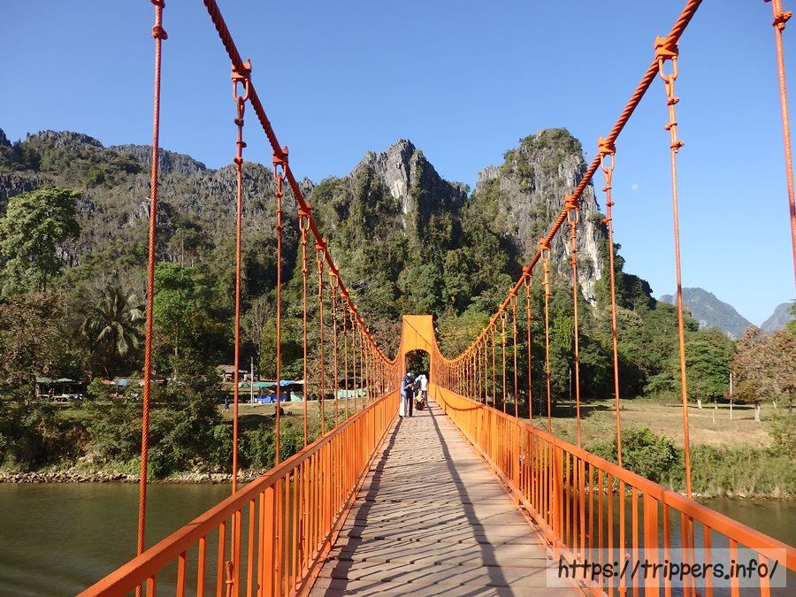 自転車に乗ってブルーラグーン1へ向かいます。ブルーラグーンは1から5まであるようで、一番近い場所が1です。ブルーラグーンがある場所へ行くには街中からナムソン川を渡るナムソン橋を通る必要があります。通行料が必要です。