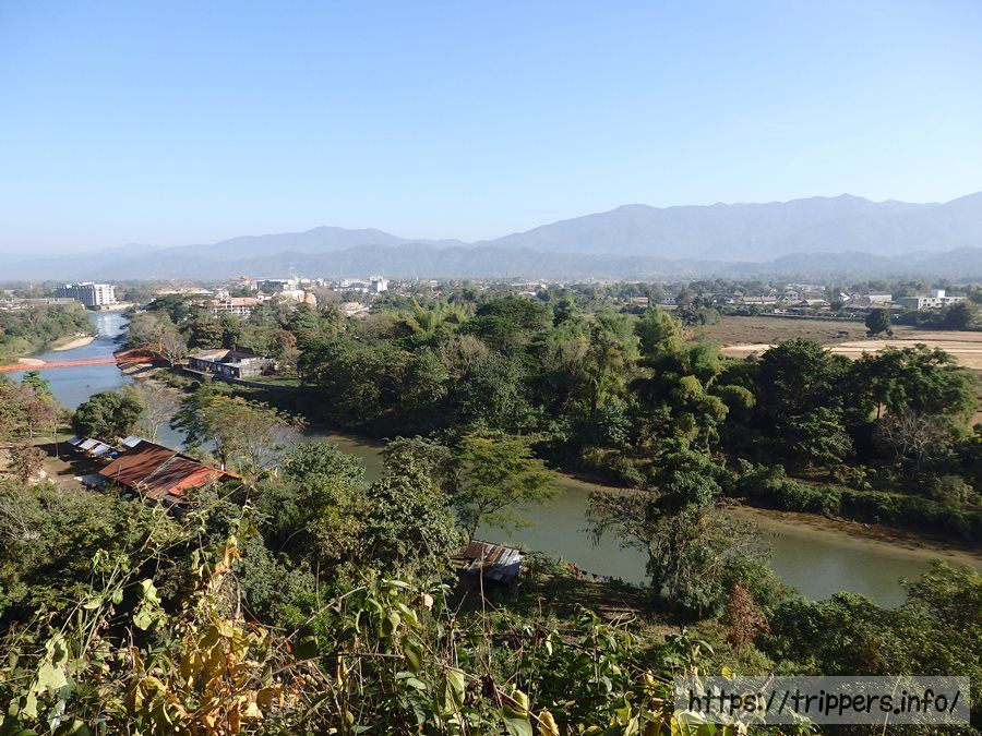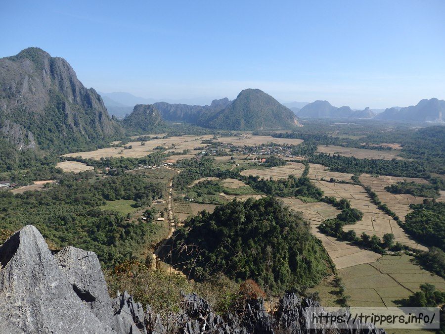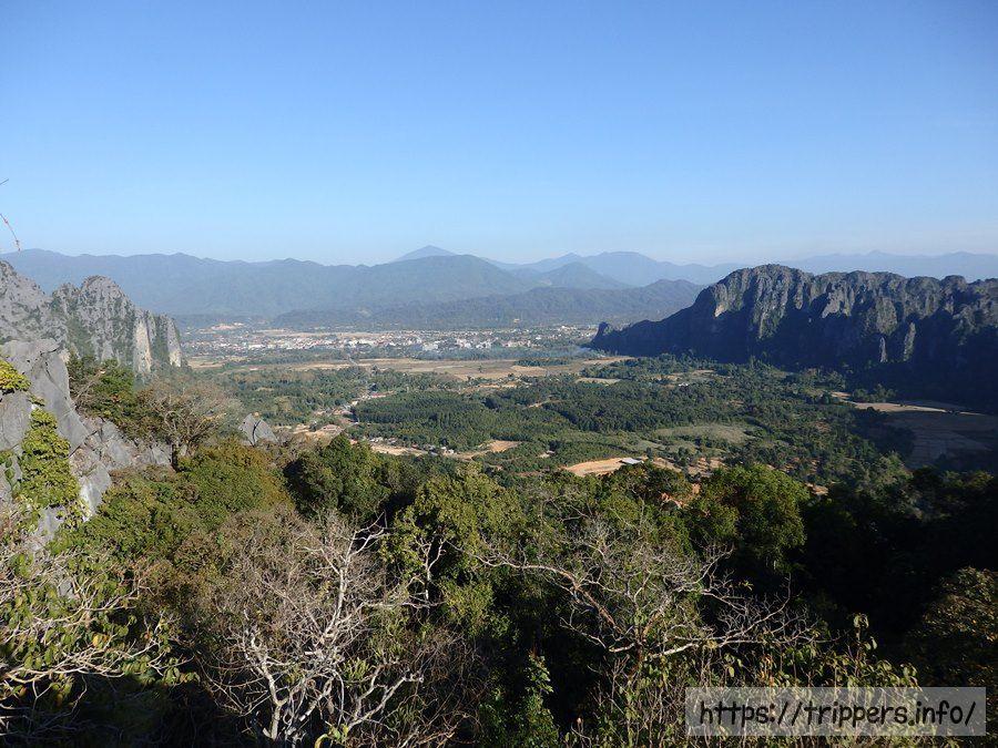 反対側の景色にはバンビエンの街が見えました。この山は別の山へと続くトレイルロードがありましたが、片道1時間以上かかるようなので、下山する事にします。