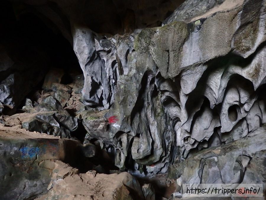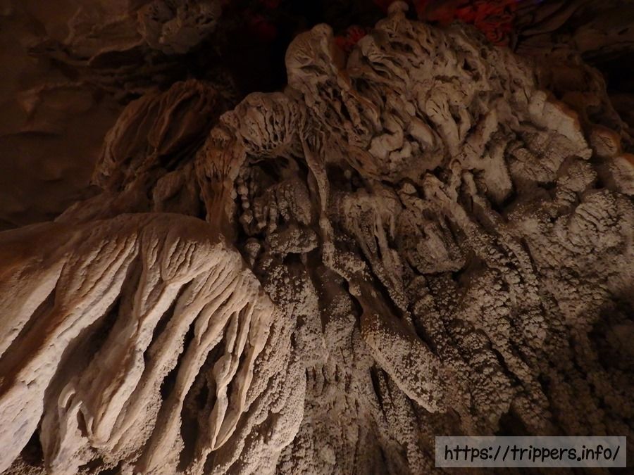エイリアンの強酸によって溶かされた人間の集合体のように見えます。一番奥まで行くと、この先危険と書かれた紙とロープでこれ以上進めないようになっています。ライトアップされておらず真っ暗ですが、まだまだ続いているようです。出入口に戻り、鍾乳洞を後にします。