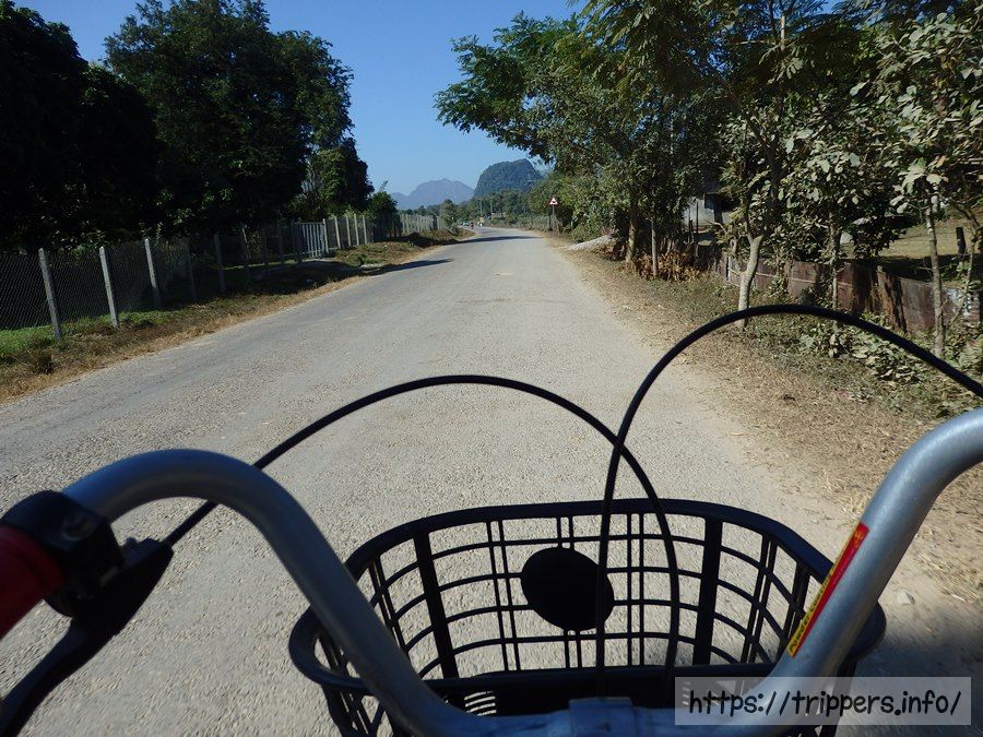 自転車レンタル屋に行き、自転車を1人20,000キープでレンタルします。この時パスポートを預けました。そしてタム・チャン洞窟へ行きました。ちなみに自転車は色んな種類がありますが、ママチャリの細いタイヤは砂利道でスリップするので向きません。なるべく太いタイヤが付いているものを選ぶと良いです。