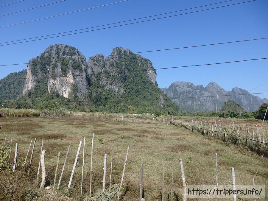 ラオスの桂林と呼ばれる景色が道路の両端に広がります。バンビエンも桂林も石灰岩のカルスト地形なので確かに似ています。