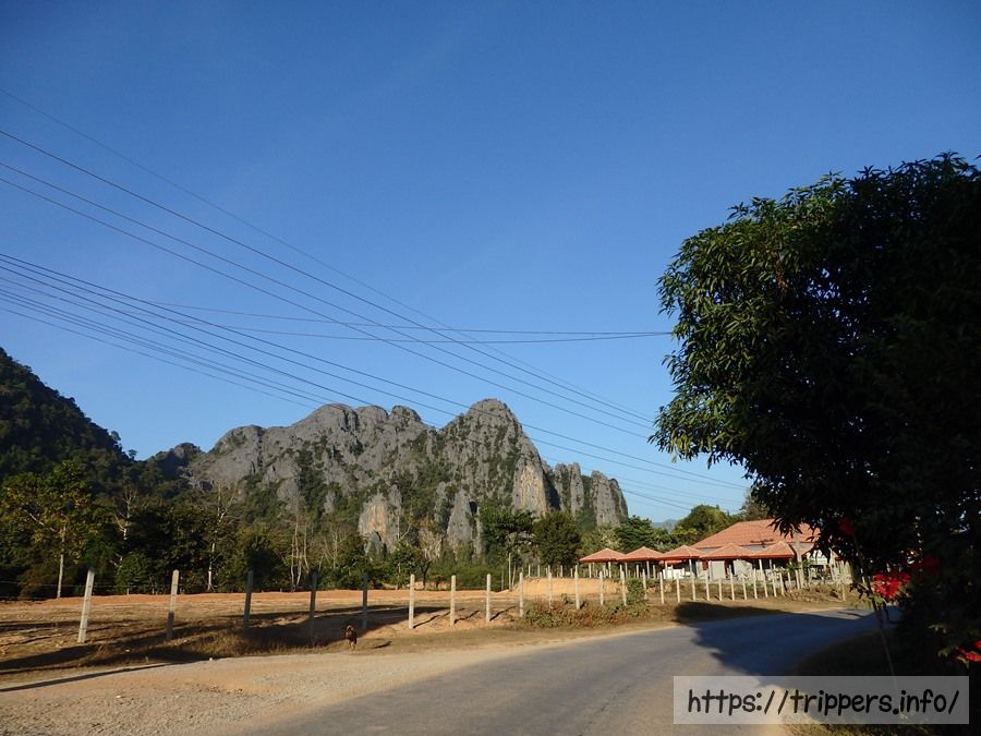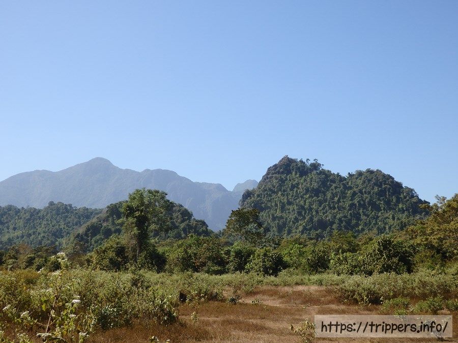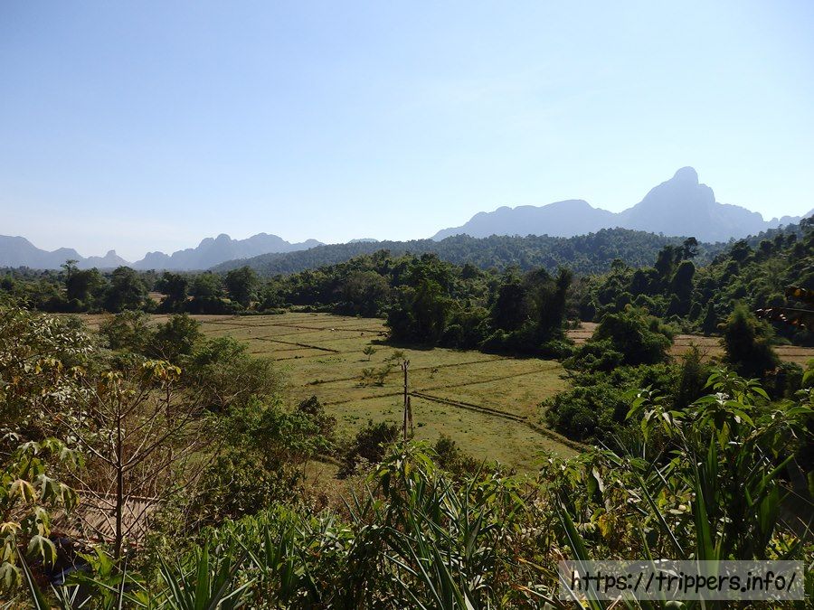 手前の右側に見える高い山の頂がNam Xay Viewpointです。結構低い山のように見えるのですが、絶景が拝めるのでしょうか。ブルーラグーン1からNam Xay Viewpoint入口までは未舗装ですが、距離はあまりないので自転車でも行けます。