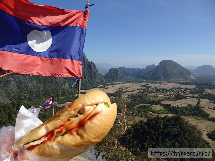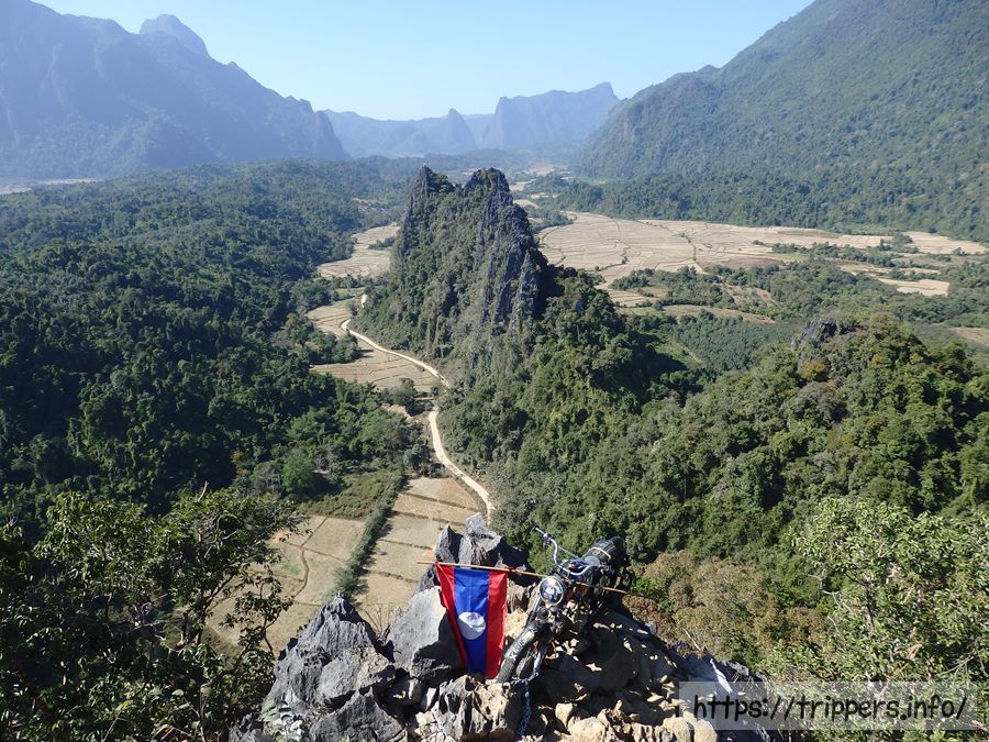 山頂に到着です。バンビエンに幾つもある山のビューポイントの中でここが一番有名で人気だと思います。山頂にはバイクと国旗が置かれており、バイクに乗って撮影すれば映えます。