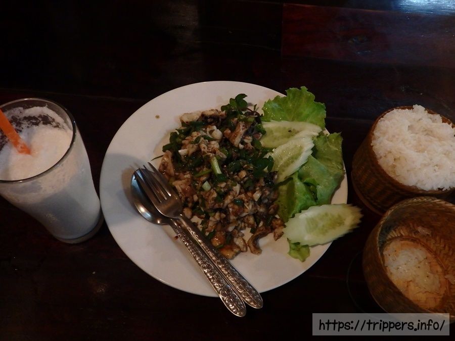 夕食はトリップアドバイザーで上位になっていた地元レストランOh La Laで食べる事にしました。ラープ・パーと言うラオスの代表料理です。パーは魚を意味し、鶏肉だとラープ・カイとなります。ラープは肉や魚をミンチにして香草等と混ぜたものです。現地の辛さがありましたが、抑え目だったので食べられました。味は美味しいです。