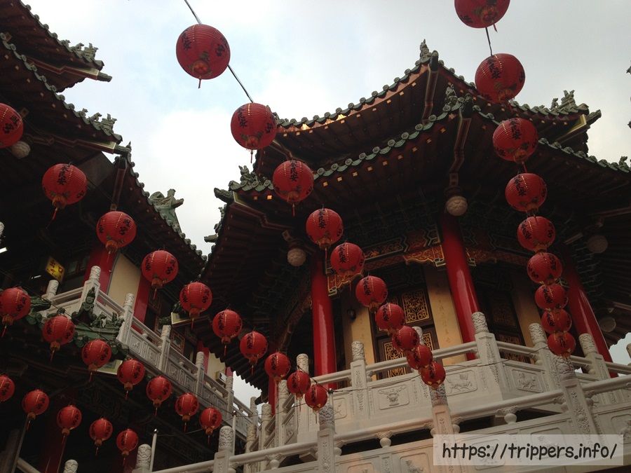 巨大なビルが目立って、ホテルの玄関かと見違えるような建物が三鳳宮。ビルと比較すると小さく見えてしまうかもしれないですが、三殿に分かれた中国北方式宮殿造りが立派な建物でした。