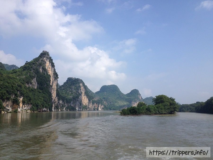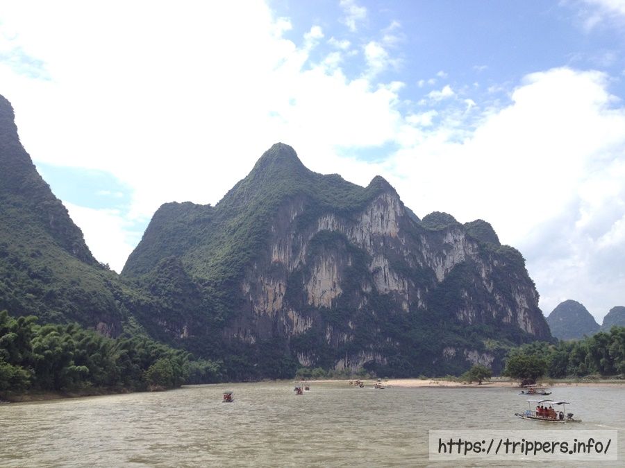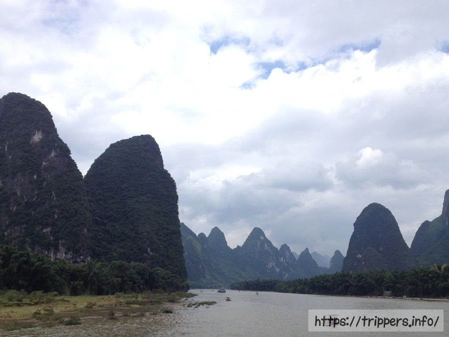 今日は桂林の一番の目玉である漓江下りをやって陽朔まで向かいます。漓江の川を囲むように山水画の景色が広がっており、その自然風景を堪能します。山水画のような景色になっているのは桂林がカルスト地形であるからです。川を下っていく中で幾つか有名な景色が観られます。