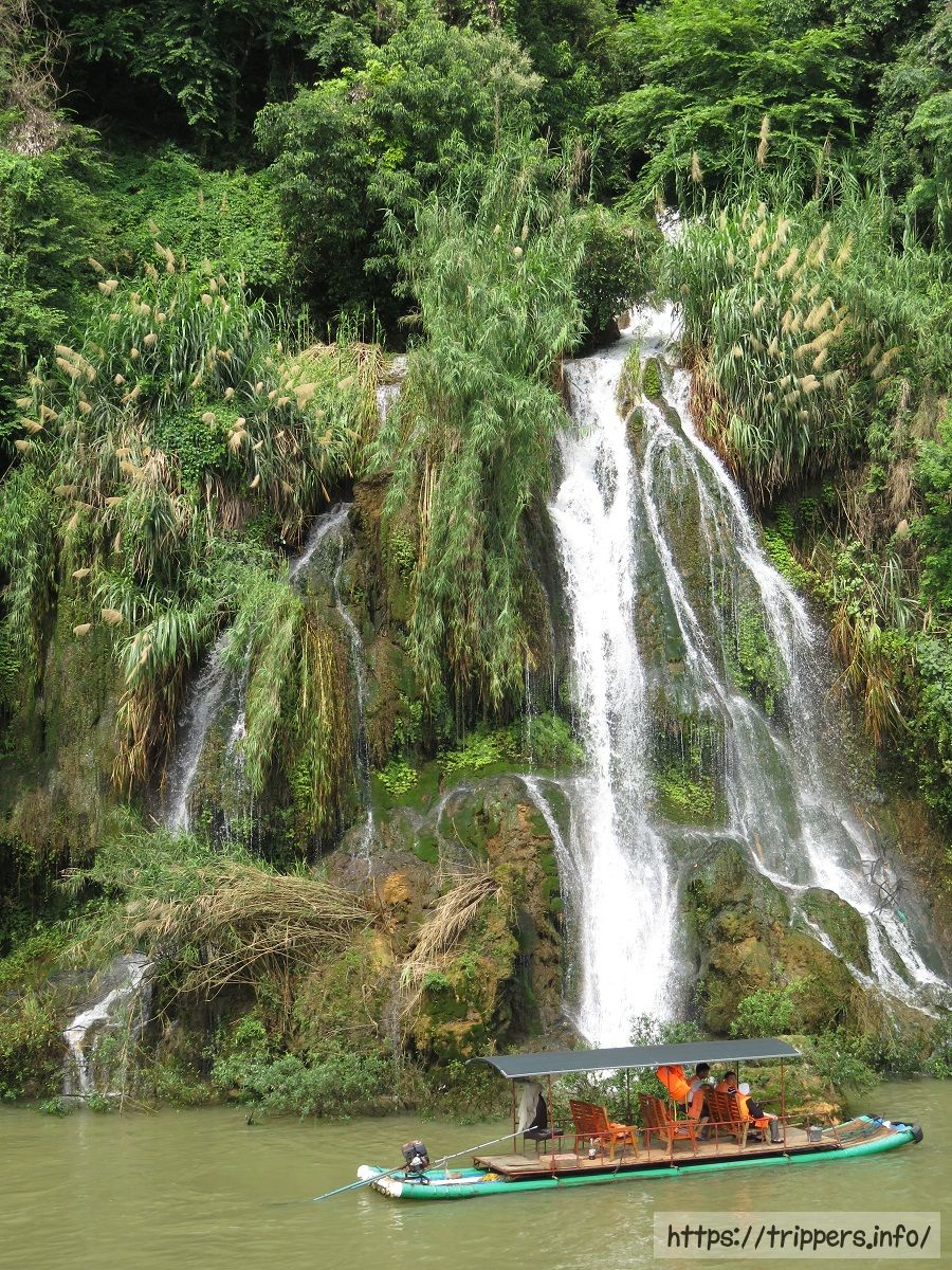 中国国内の観光客用の大型船が通過していきました。船の後部で昼食が調理されているようです。
