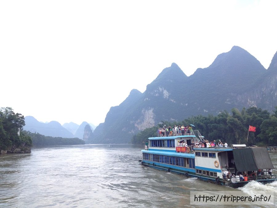 中国国内の観光客は小さな竹船で漓江下りをしているようです。1グループ毎の船になっているので、私はこっちの小舟に乗りたかったです。小舟がミニチュア模型に見えてしまうほど規模が大きい自然です。