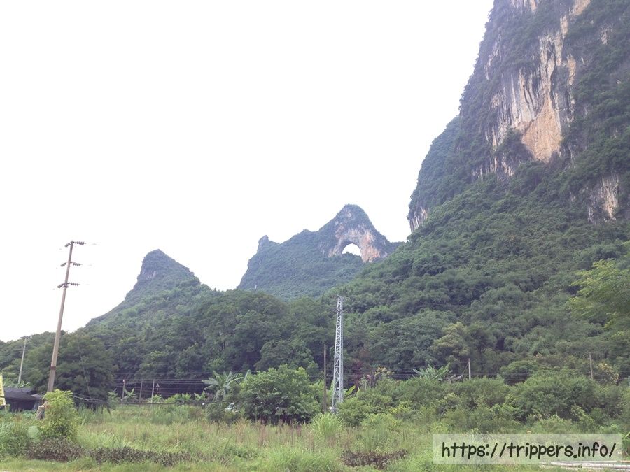 山の中腹が丸くくり抜かれている山が月亮山です。抜かれた部分が月に見えます。