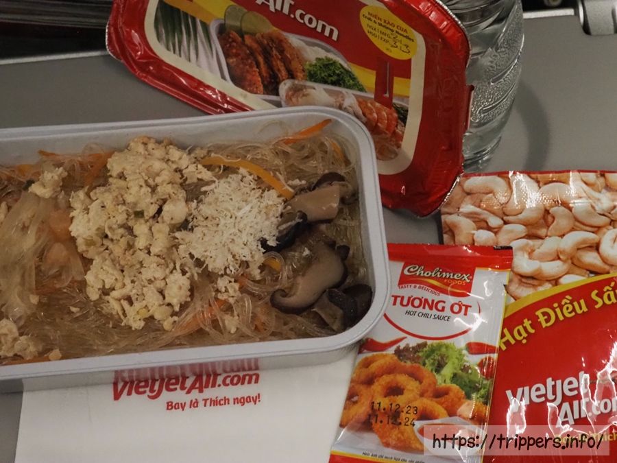 まずはベトジェットエアに乗ってベトナムのハノイへ向かいます。搭乗時間が2時間程の遅延になってしまいました。有料の機内食は航空券を購入した時に注文してあります。春雨料理とナッツと水のセットメニューでした。