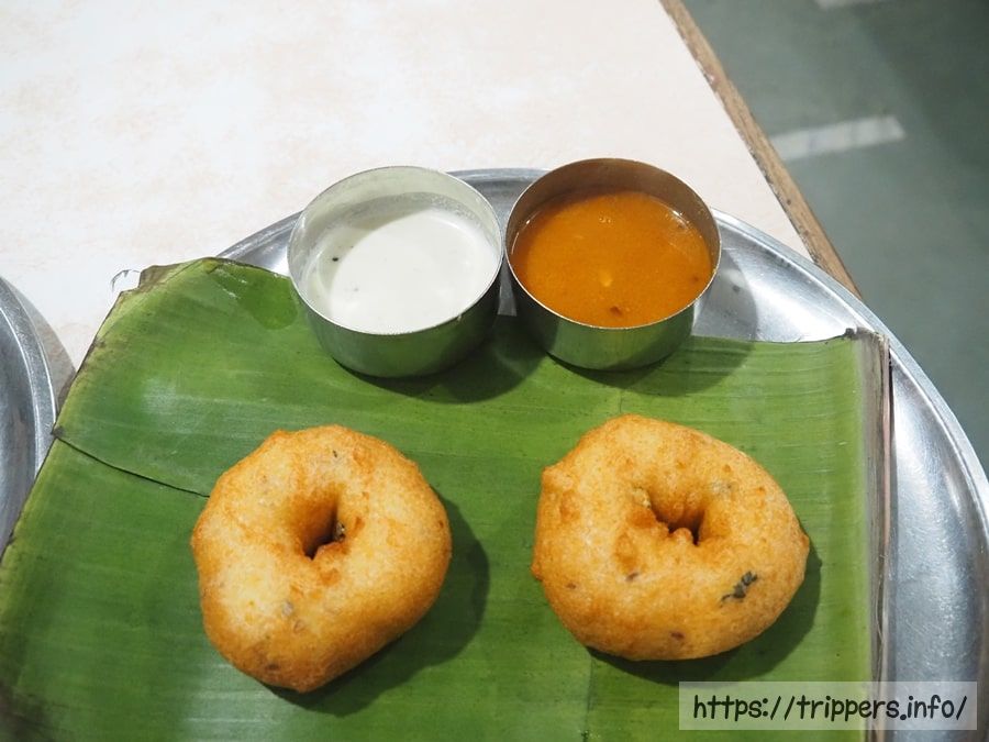 ヴァダはトゥール・ダルと呼ばれる豆から作った揚げドーナツです。重曹が入っているのか、苦みを感じました。ソースはイドゥリと同じです。食事を終えたらホテルに戻り、今日はおしまいになります。