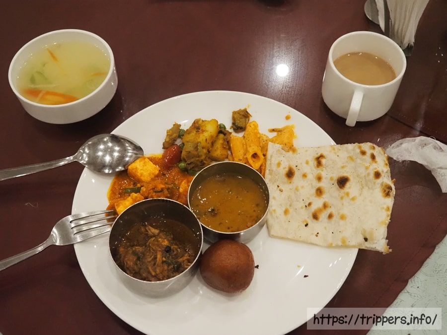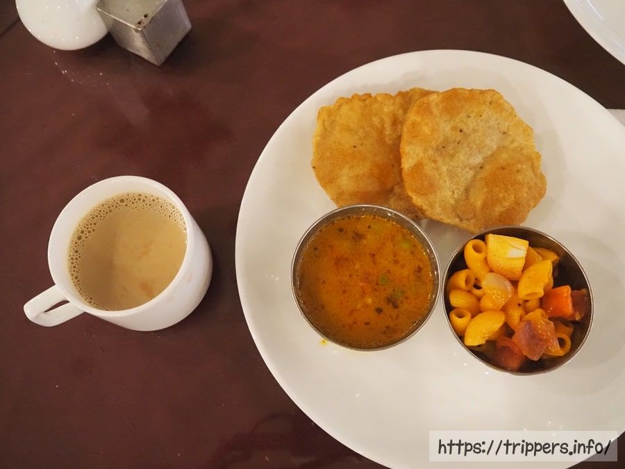 ホテルで朝食バイキングを頂きます。膨れたパンのようなものは、チャパティの生地を焼かずに油で揚げたプーリーです。北インドではナンよりもチャパティやプーリーがよく食べられています。インド定番の飲み物であるチャイは、日本のミルクティーではなく、そこに様々な香辛料が入っているのが特徴です。