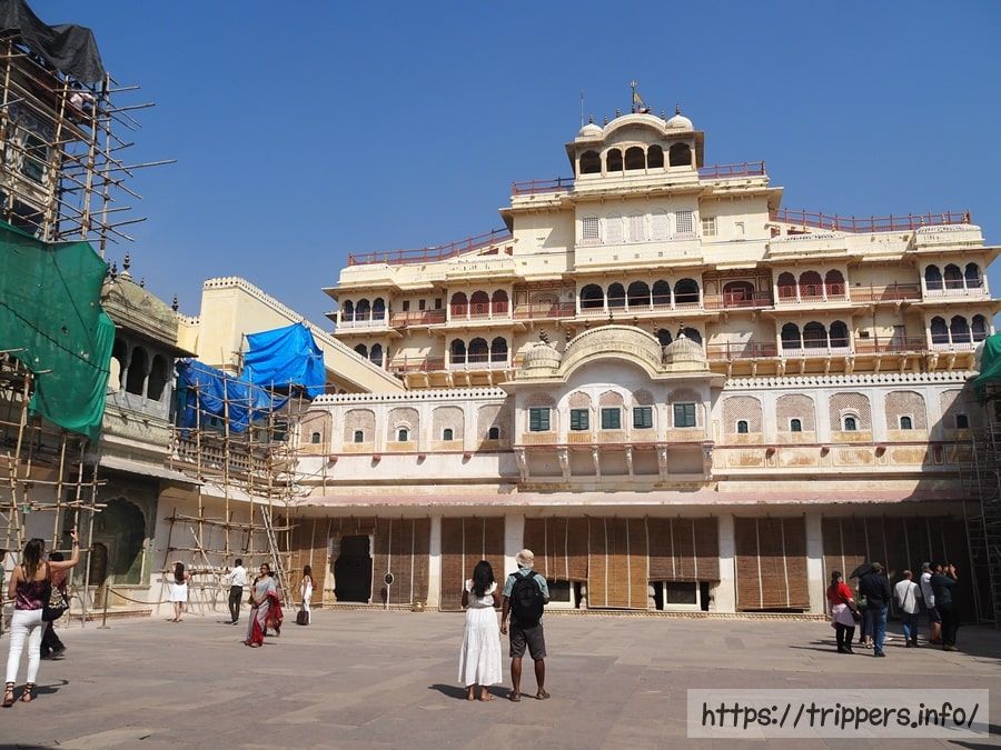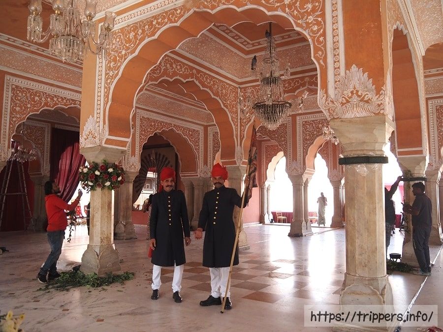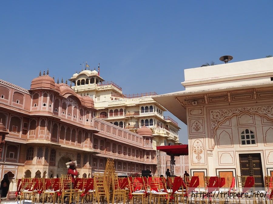 まずはシティ・パレスを観光していきます。現在も一部が王族の住居になっているとのことで、一番奥にある7階建ての宮殿、チャンドラ・マハル(月の宮殿)がそれとのことです。ここはバードラ・チョークと呼ばれる広場で、中央にある貴賓謁見の間として使用されたディワニ・カースに入ります。