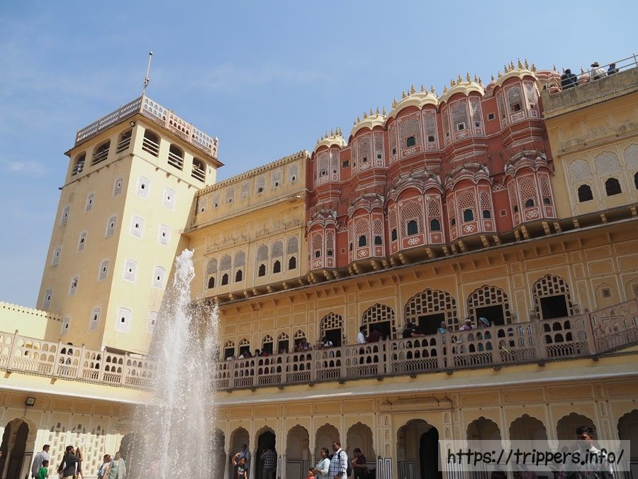 ハワー・マハル(風の宮殿)へ入場します。ピンク色をした砂岩を外壁に用いた5階建ての建造物で、953の小窓が通りに面しています。それらの窓から、宮中の女性達がそっと外を眺めたと言われています。宮中の女性は宮殿から出ることが出来なかったため、どんな気持ちで窓から景色を見ていたのでしょうか。