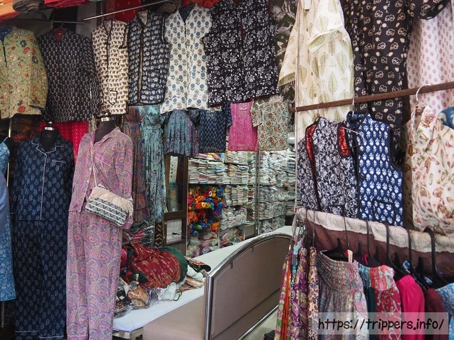 見下ろしていた通りを少しだけ見学していきます。販売している衣類は自然素材で染められておらず、化学染料が使われているため、選択すると色落ちしてしまうとのことです。ワニ革などは販売資格が必要で、バッグなどは偽物と話していました。