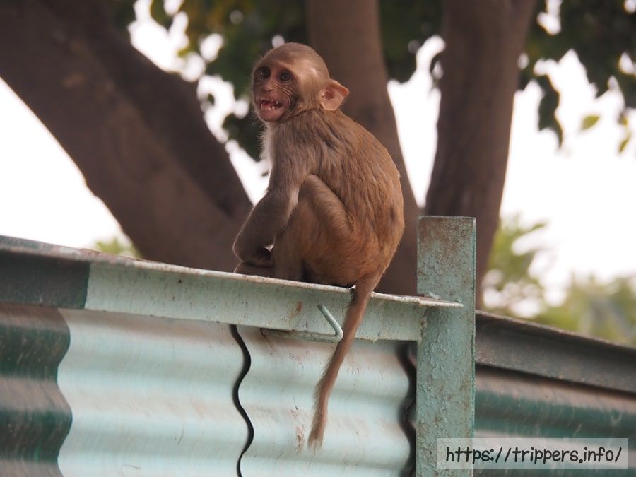 ニホンザルよりも尻尾が長く、アカゲザルでしょうか。インドでは個体数が多いようです。