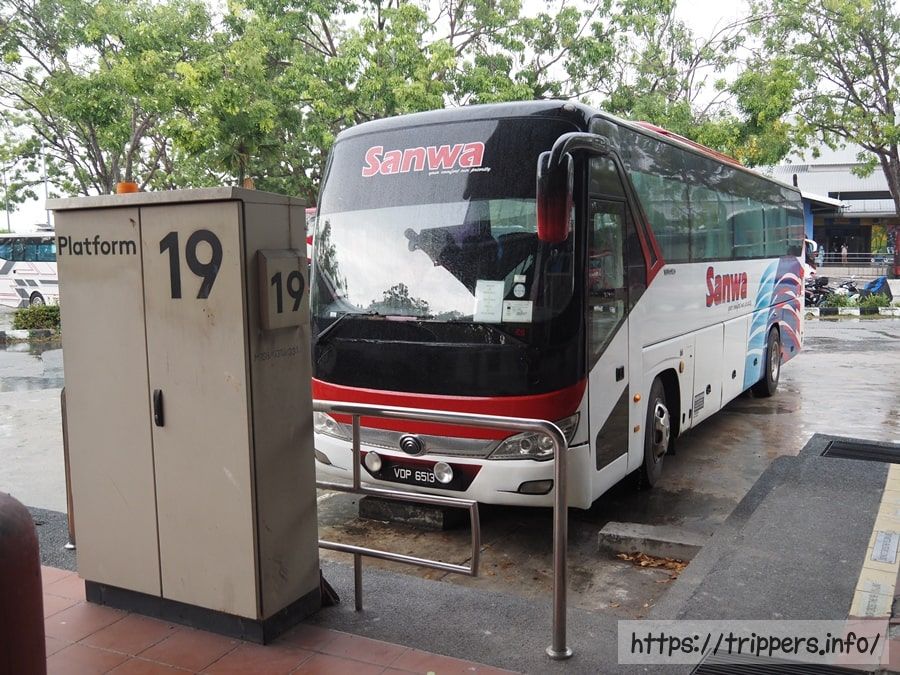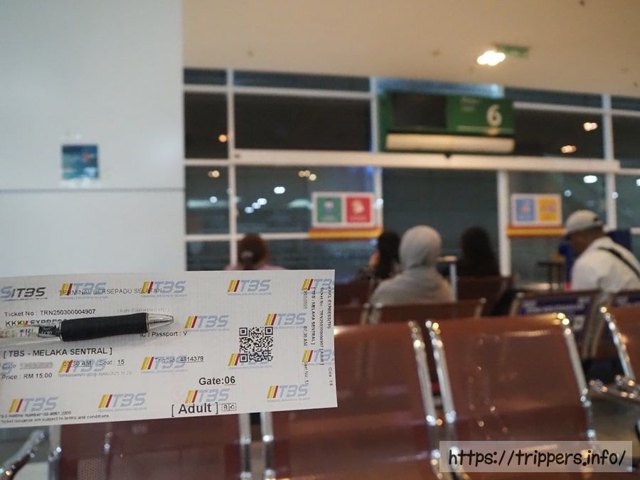 早朝、ホテルからTBSバスターミナルまで歩き、バスチケットでバス乗り場の改札を通過します。バスの値段は15リンギット(RM)でした。バスのランクを落とすと12リンギットです。朝食を食べる時間がないので、昨日買った菓子パンで少しお腹を満たします。