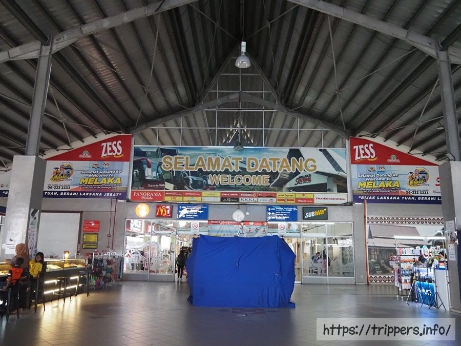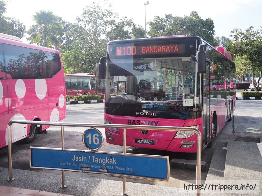 マラッカにあるセントラルバスターミナルに到着しました。ここは、左半分が長距離用のバスターミナル、右半分が近距離用のバスターミナルに分かれています。近距離用に移動したら、16番バス停で「M100系統 BANDARAYA行」のバスに乗車します。ガイドブックによっては17番バス停と記載されているようですが、間違いです。