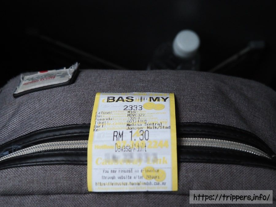 オランダ広場にある⑤Muzium Belia Malaysia(Jalan Laksamana)バス停で下車します。降りる時は日本のバスのようにベルを押しますが、音が鳴りませんでした。マラッカをバスで旅行したブログを拝見すると、M100系統バスの乗車賃が2リンギットと紹介されていたのですが、領収書を見てみると、実際は1.3リンギットでした。余計に支払ってもお釣りはありません。