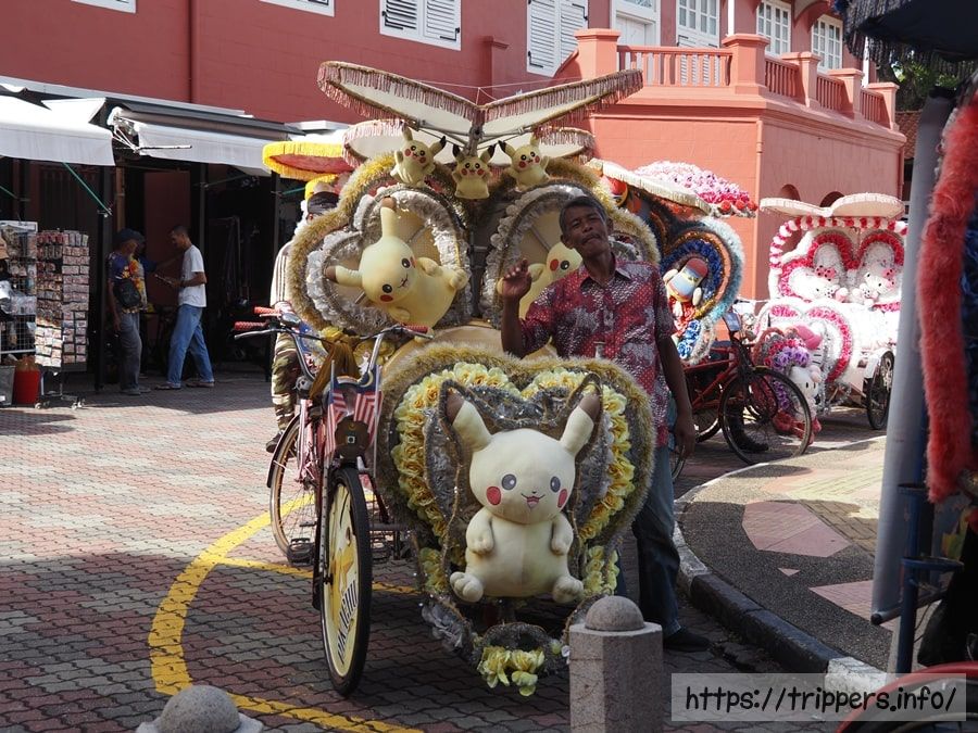 様々なキャラクターで派手にデコレーションしたシクロが並んでいました。乗るならピカチュウ号が良いですが、今回は全て徒歩圏内の観光なのでパスします。露店で帽子を1つ購入した後、Spak Sdn. Bhd.で3万円を現地通貨に両替しました。ここの両替所はレートが悪くないとネットの日本人の口コミにあったので、利用しました。ATMの方がレートが良いと思いますが、ATMよりも細かい紙幣が手に入る利点があります。両替を実施したのは、後のペナン島で1万円だけで、合計4万円になります。