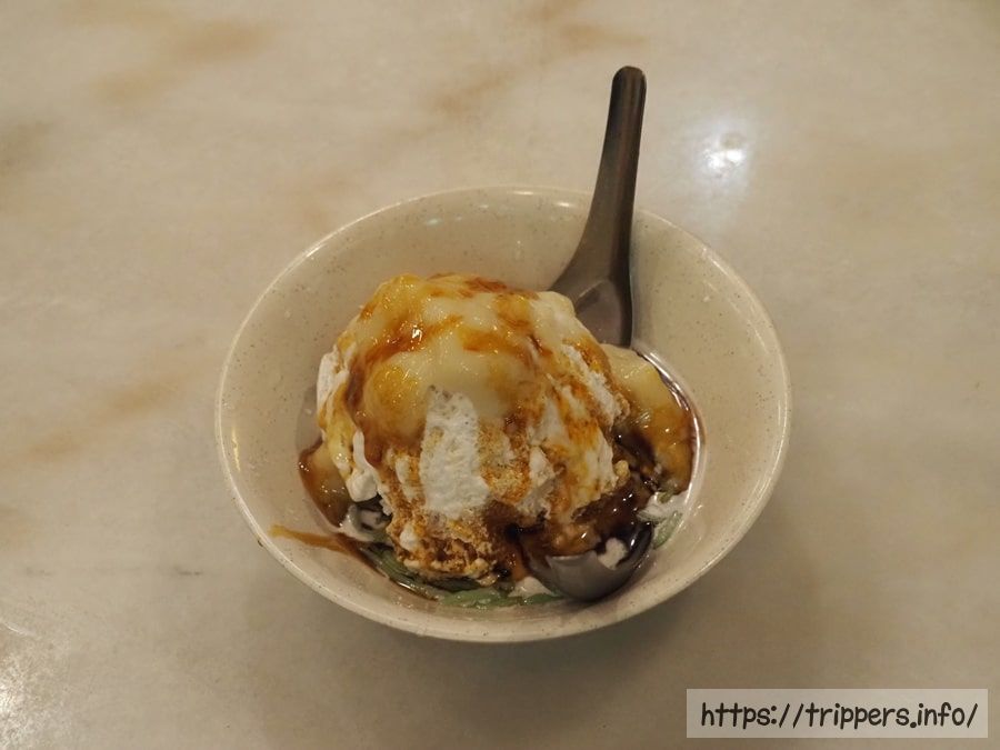 食事を終えたら、今度はデザートを注文します。ババドリアンチェンドルです。秒で溶けだすかき氷なので、必ずババラクサとは別で注文する必要があります。ドリアンのソースが美味しく、熱くなった身体を冷やしてくれました。
