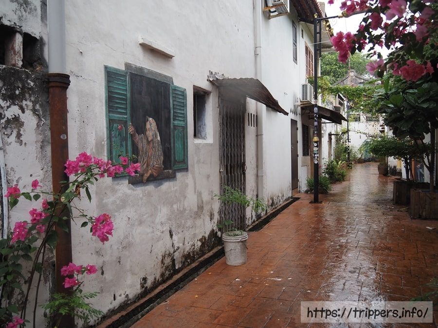 雨が少し降り始めてきました。マラッカ・ウォールアートを通ります。コタバルやペナン島でも壁画アートが存在し、一番有名なのはペナン島のジョージタウンだと思います。