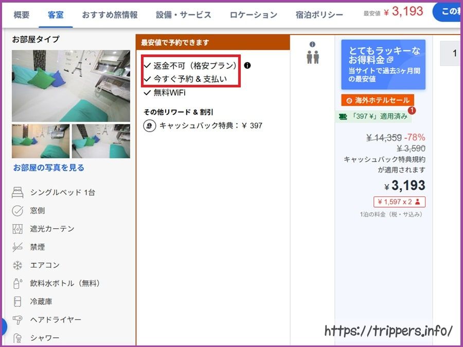 対処方法としては、予約時にアゴダページで「デポジット」の文字検索をすること、一定期間はキャンセル無料のホテルを選ぶこと、グーグルなどアゴダと無関係のサイトで口コミを調べることです。実際にグーグルとTrip.comでの口コミは最悪で、アゴダでの評価「7.5すごく良い」とは真逆でした。口コミを読むと、既に支払い済なのにチェックイン拒否されたり、デポジット返金トラブルも発生している模様です。Trip.comで予約しようとすると、デポジットの記載は見当たりませんでしたが、口コミを見るとデポジットは存在するようです。