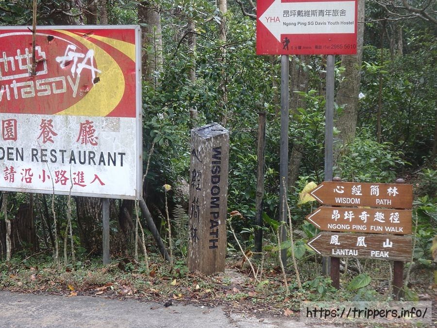 ①東涌駅から昂坪360のケーブルカーで昂坪駅へ行く。②どちらで行っても、到着後少し歩くと昂坪広場へたどり着きます。そのまま道なりに少し歩きます。③天壇大仏へ続く階段の前を通り過ぎ、ハイキングコースへ向かう。(心経簡林への標識あります。)④ハイキングコースを10分程進むと到着。
